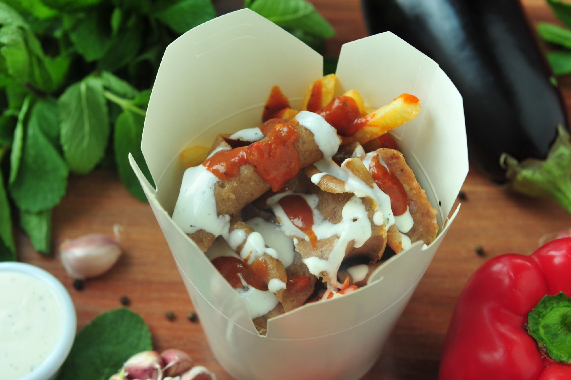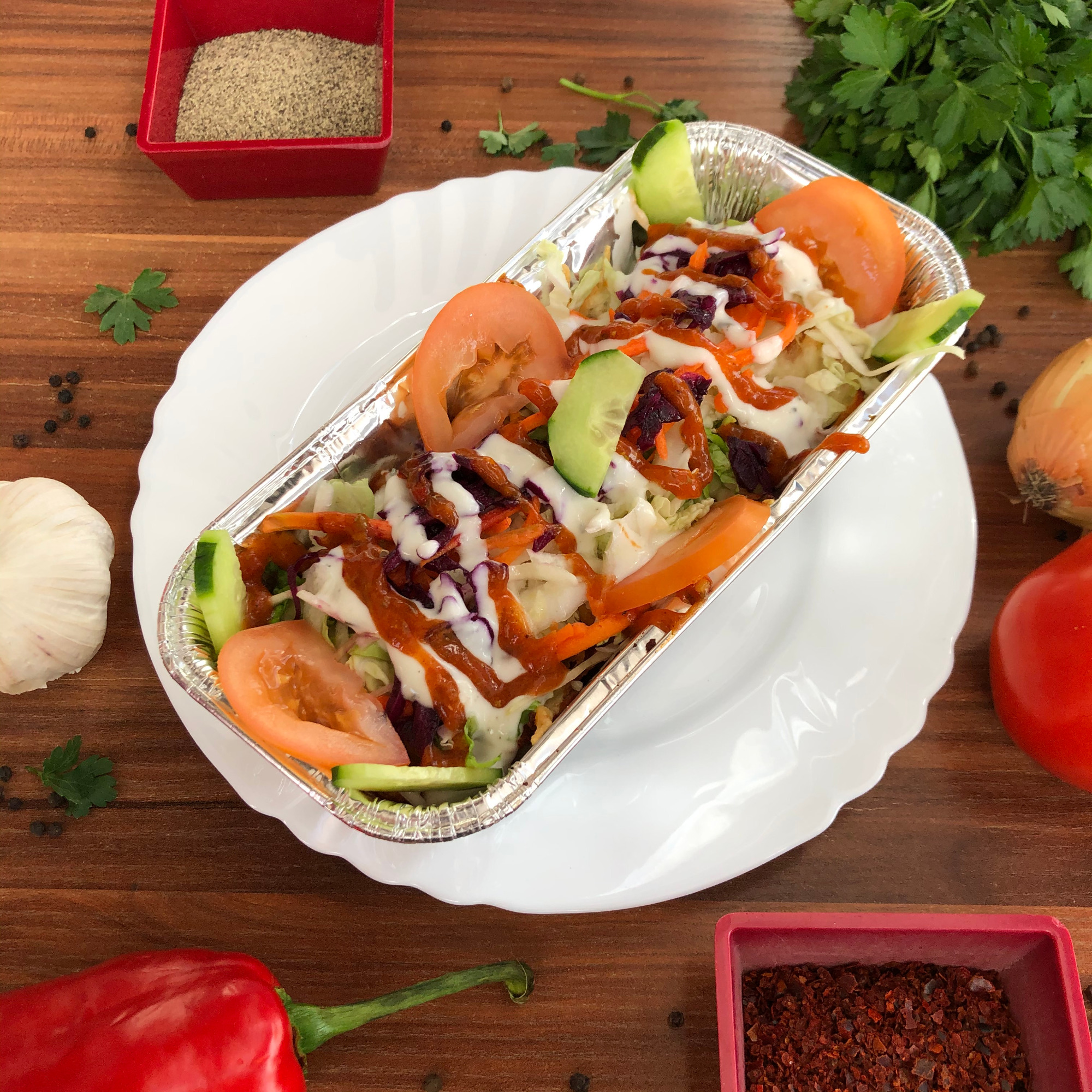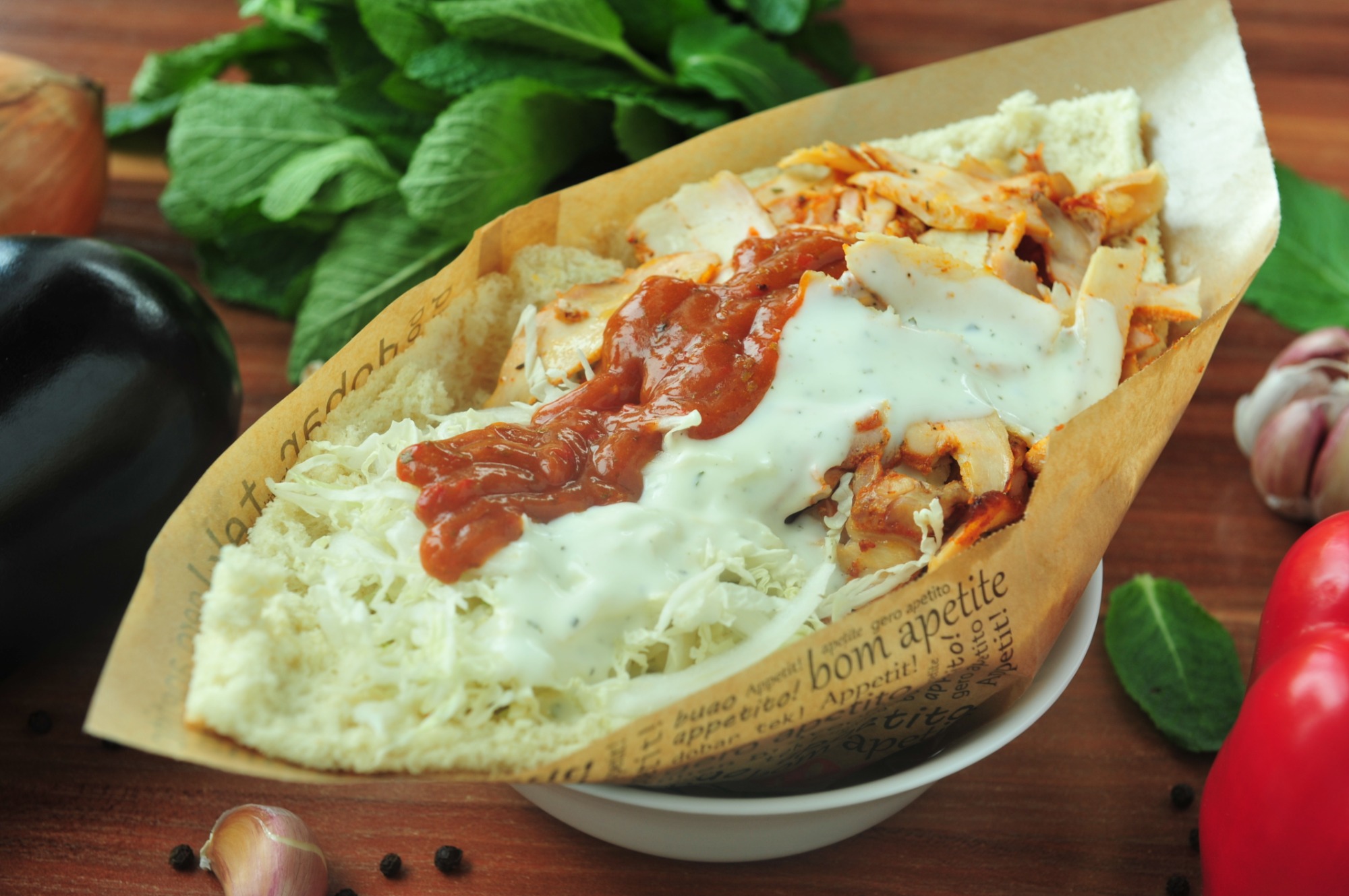 160g mięsa wołowego lub 200g mięsa z kurczaka, surówki, sałata lodowa, pomidor, ogórek, cebula, sosy